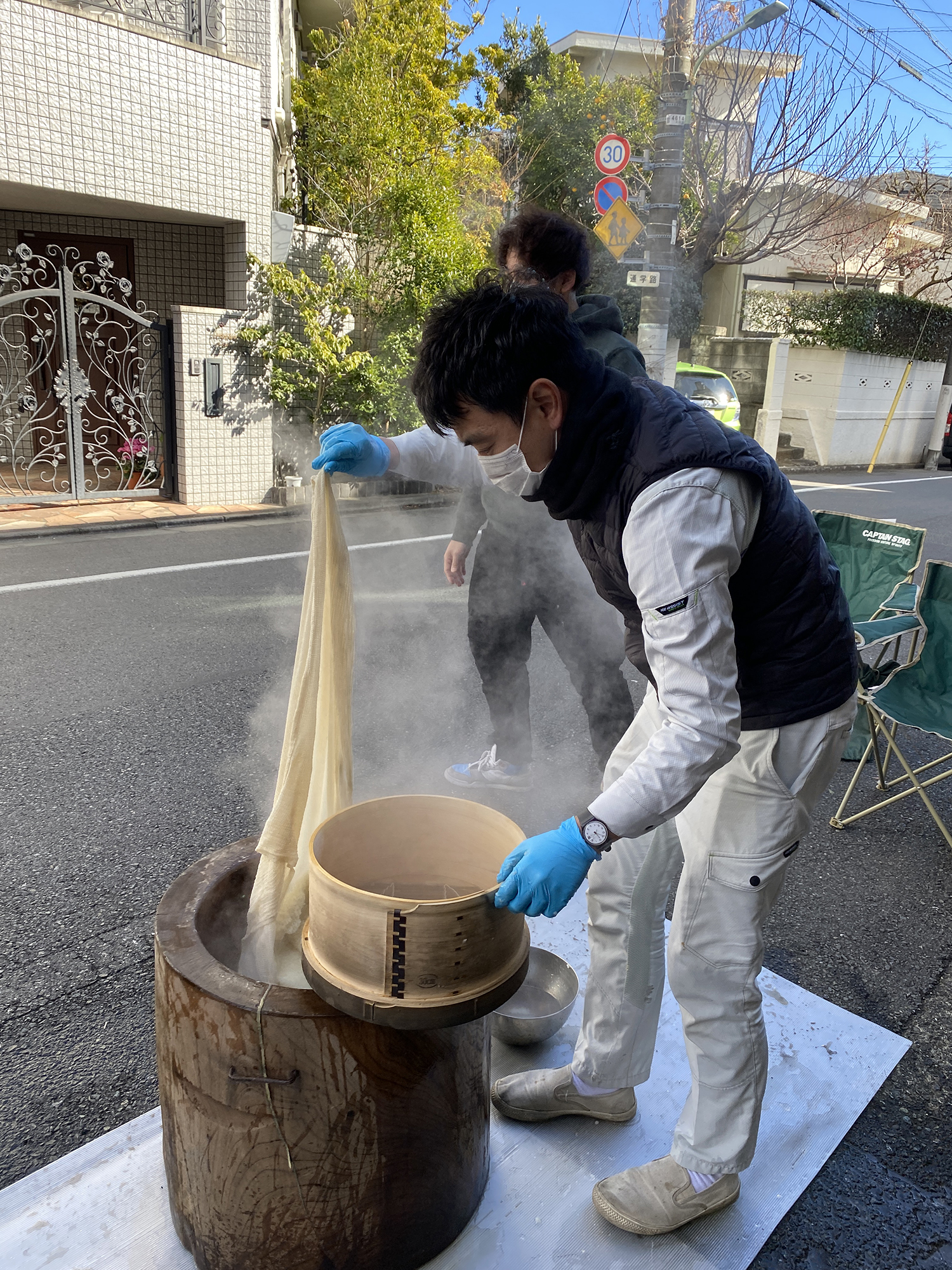 さらに蒸していきます。せいろの3段は時間ごとにおろして、また新しいもち米でセッティングしていきます。
